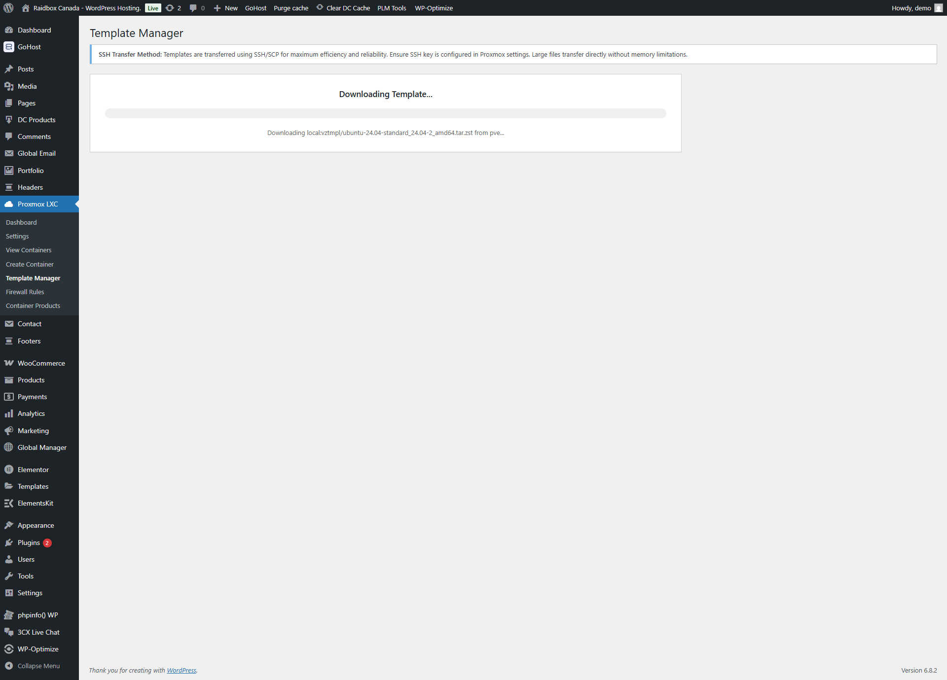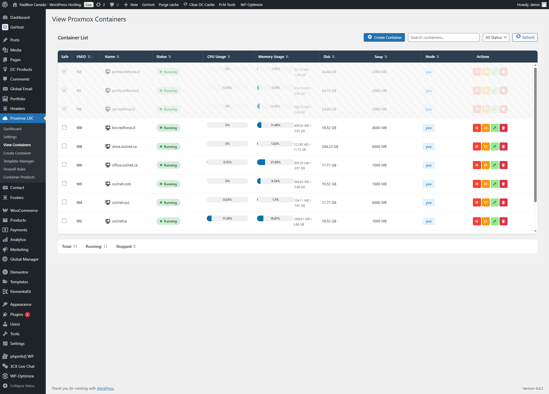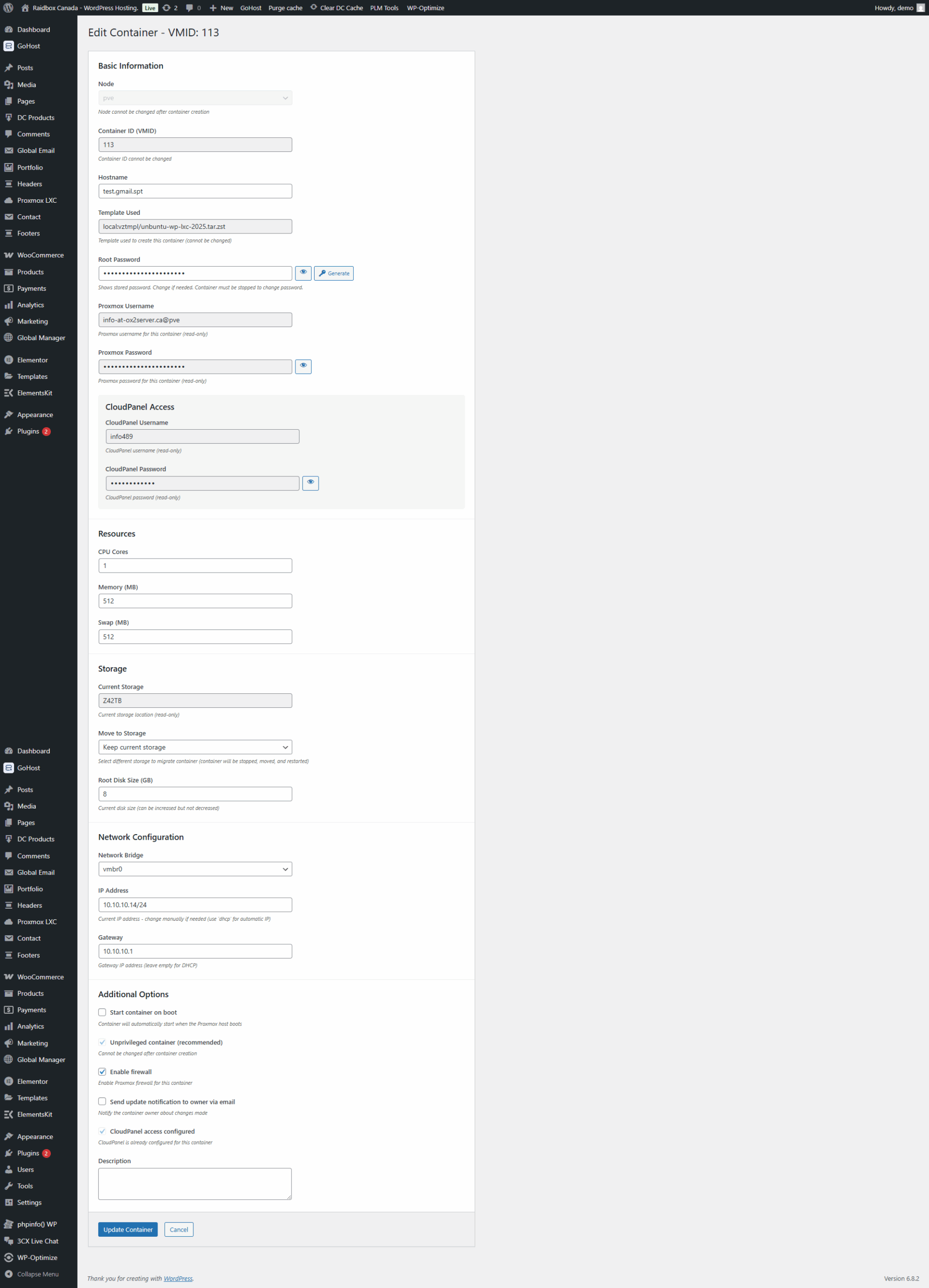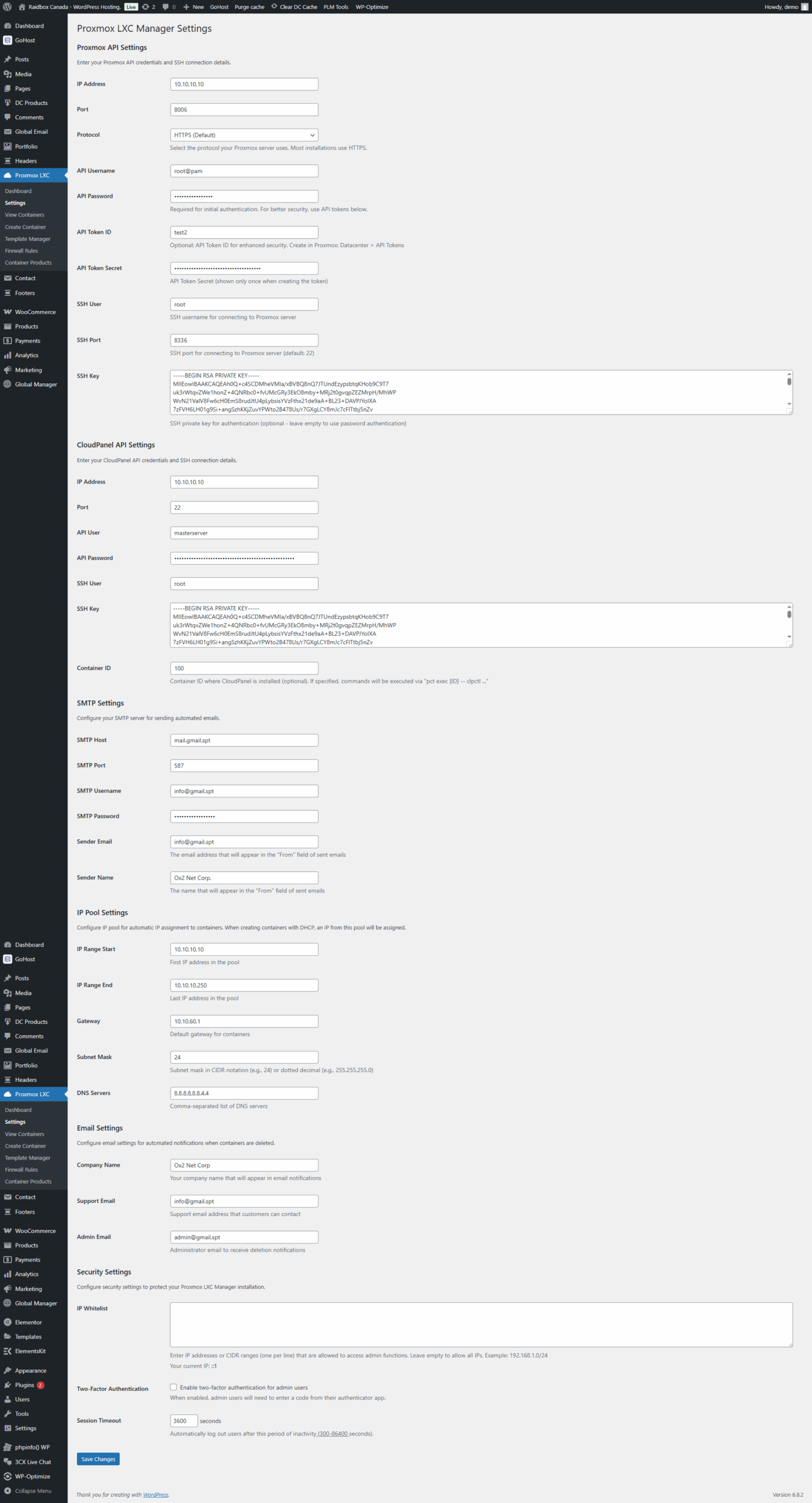 Seamlessly manage Proxmox LXC containers from your WordPress site. Create, start, stop, and edit containers, manage storage, templates, and IPs, and control user access all from an intuitive WordPress interface. Perfect for agencies, hosting providers, and IT teams.