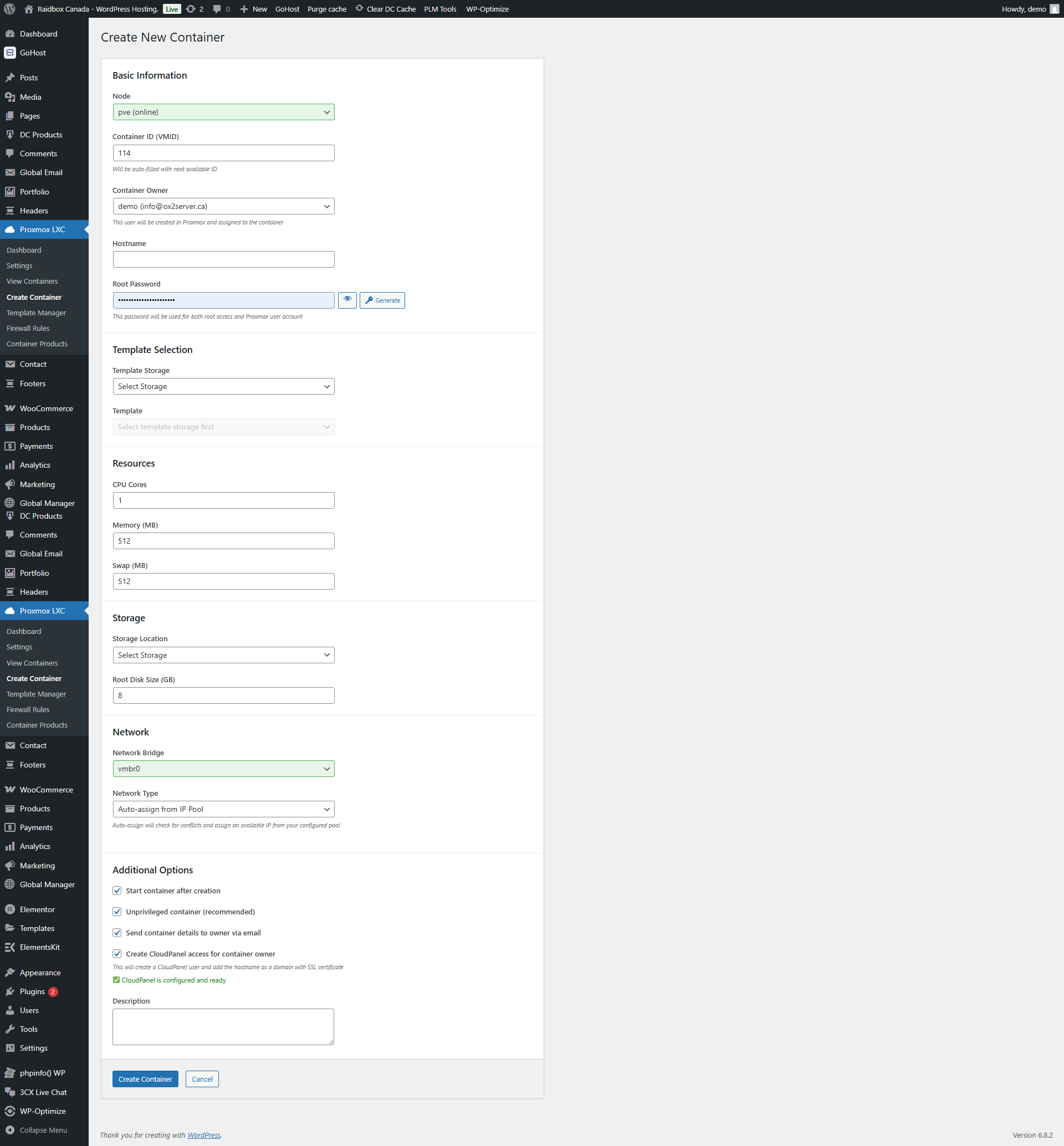 WP Proxmox LXC Integration requires access to a Proxmox server to function. For your convenience, we can assist with: